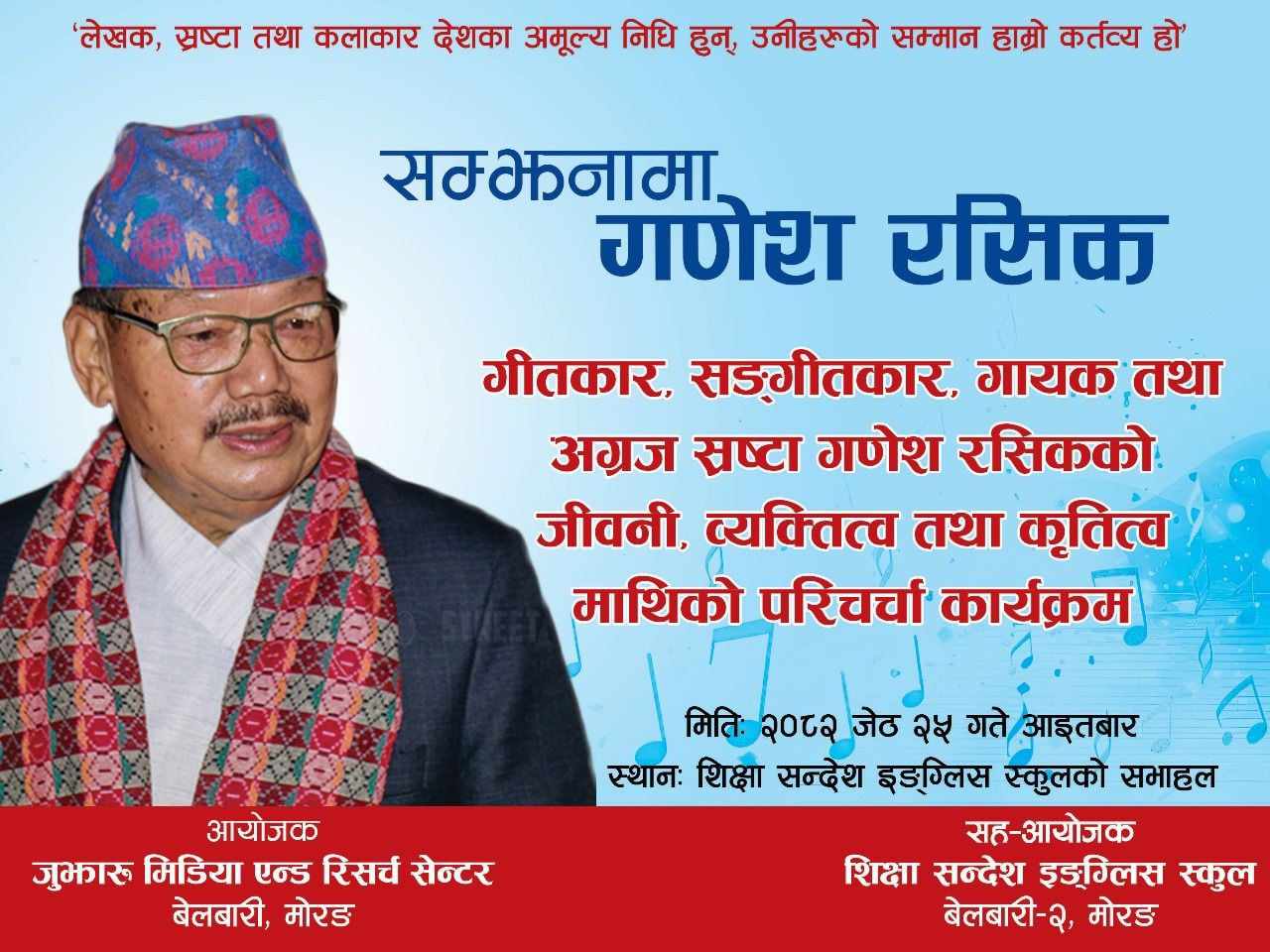 २५ जेस्ठ २०८२ बेलबारी-मोरङ । मोरङको बेलबारीमा ‘सम्झनामा गणेश रसिक’ कार्यक्रम सम्पन्न भएको छ।