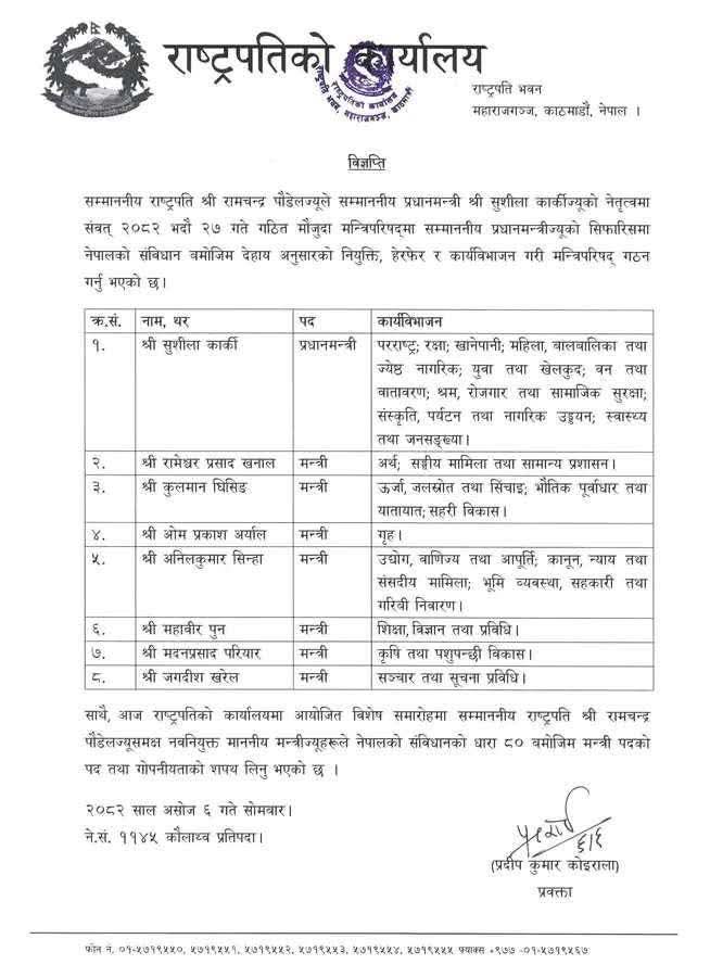 अब कार्की मन्त्रिपरिषद ८ सदस्यीय बनेको छ। यसअघि कार्कीसहित मन्त्रिपरिषदमा रामेश्वर खनाल, कुलमान घिसिङ र ओमप्रकाश अर्यालले जिम्मेवारी सम्हालेका थिए। खनाल अर्थ, घिसिङ उर्जा र अर्यालले गृह मन्त्रालयको जिम्मेवारी सम्हालेका थिए।
