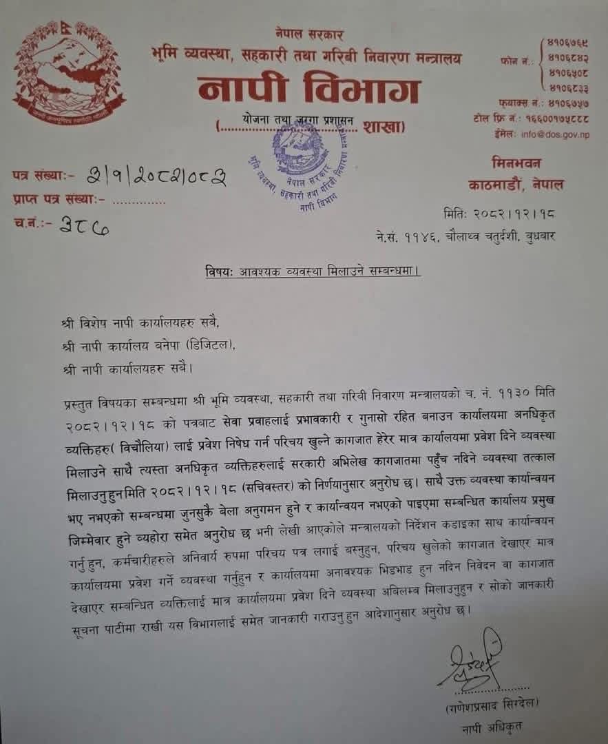 जग्गा प्रशासनसँग सम्बन्धित कार्यालयहरूमा विभिन्न बहानामा बिचौलिया प्रवेश गर्ने र अत्यन्तै गोप्य तथा संवेदनशील कागजातमा अनियन्त्रित पहुँच राख्ने गुनासो बढेपछि मन्त्रालयले यस्तो कदम चालेको हो।