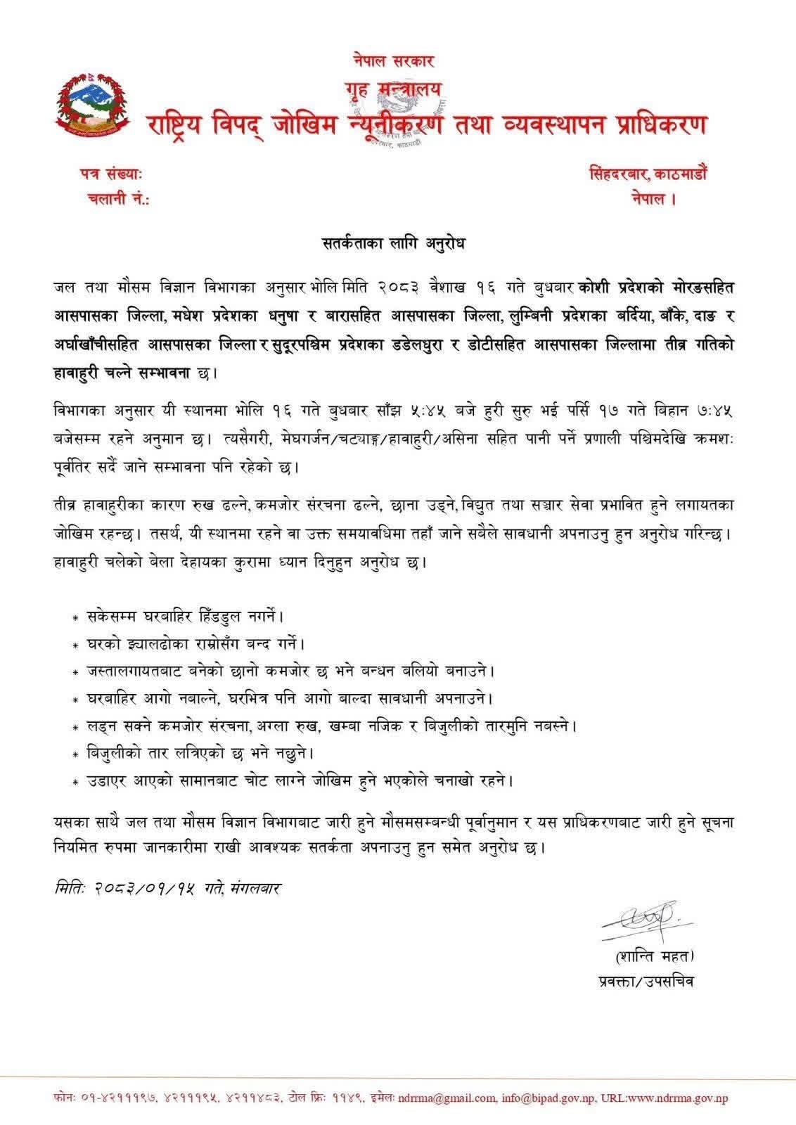 • हावाहुरीका कारण हुनसक्ने सम्भावित क्षतिलाई मध्यनजर गर्दै विभागले पूर्वतयारी र सावधानी अपनाउन सर्वसाधारणलाई सूचित गरेको हो । मौसम विभागले विशेष बुलेटिन सार्वजनिक गर्दै सचेत हुन अनुरोध गरेको छ ।
